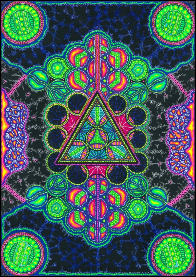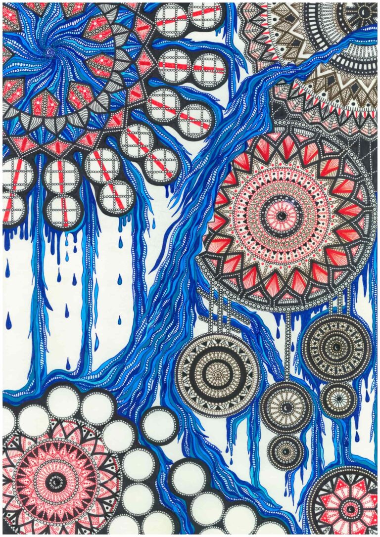 The drawings below were my very first mindful drawings. They’re whoppers – around 80cm x 60cm – and each one took a few months to draw. For over a year I sat on the floor of my nephew’s toy room, hunched over these huge boards, drawing in terrible light, while carving out portals into my subconscious mind to clear out my shadows.